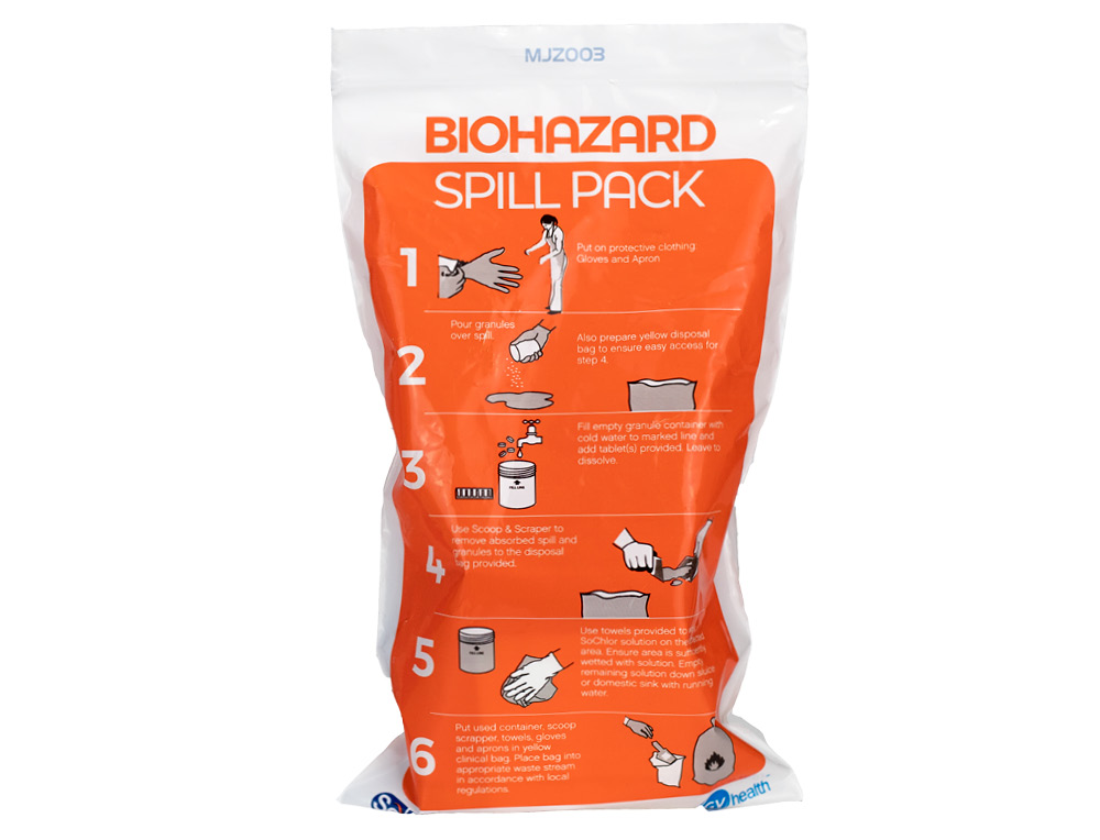 Blood / Biohazard Spill Packs are used for safe clean up and disinfection of blood spillages. The single use pack is supplied with all PPE, SoChlor™ NaDCC Granules and SoChlor™ TAB Chlorine release disinfection tablets. SoChlor™ NaDCC Granules release a chlorine disinfectant on contact, absorb the spill, kill pathogens on contact and reduce cross contamination risk. SoChlor™ TAB Chlorine release disinfection tablets dilute to produce 10,000ppm concentration chlorine disinfectant solution to then wipe the surface where the spill has occurred. The solution is fully effective against blood-borne pathogens and Tuberculosis(TB).