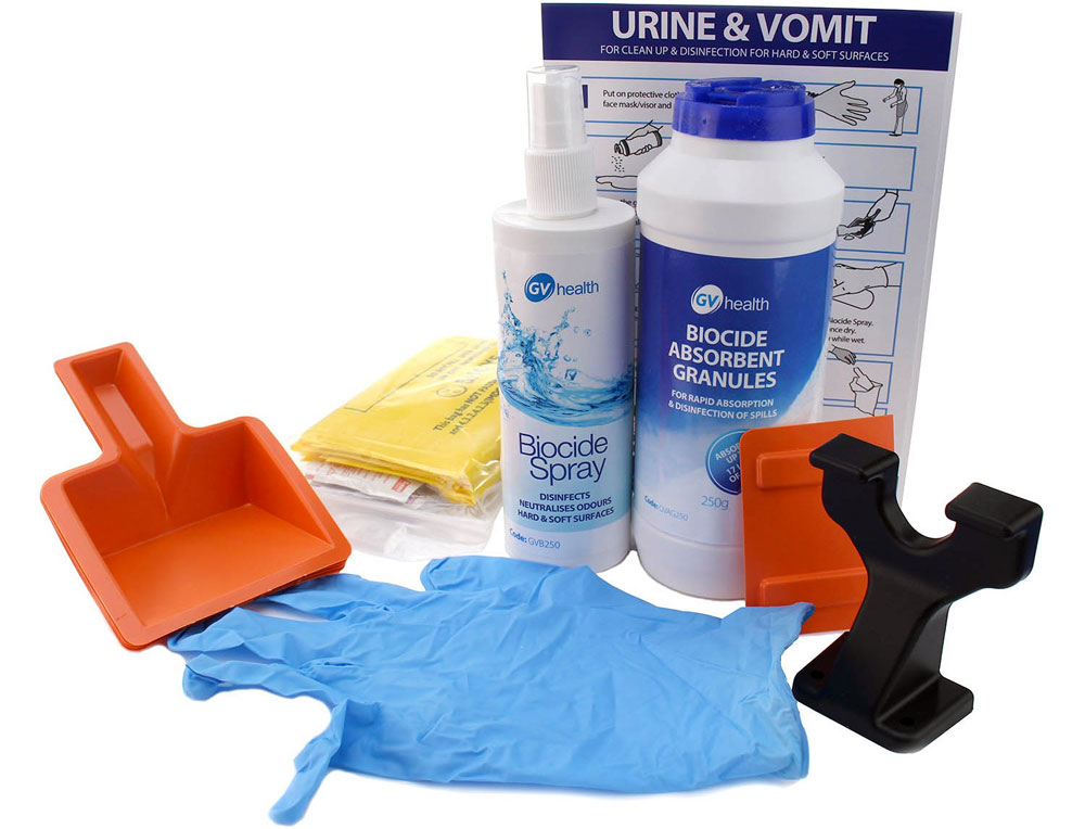 The Urine and Vomit Spill Kit is designed for the safe clean up and disinfection of 6 spillages of urine or vomit. The kit provides all required PPE and specialist products including GV High Absorbency Granules, alcohol disinfectant wipes and GV Biocide Spray to ensure best practice removal and disinfection of a spill. GV Health’s Biocide Spray further disinfects while also removing any residual odour where urine or vomit spills have occurred.