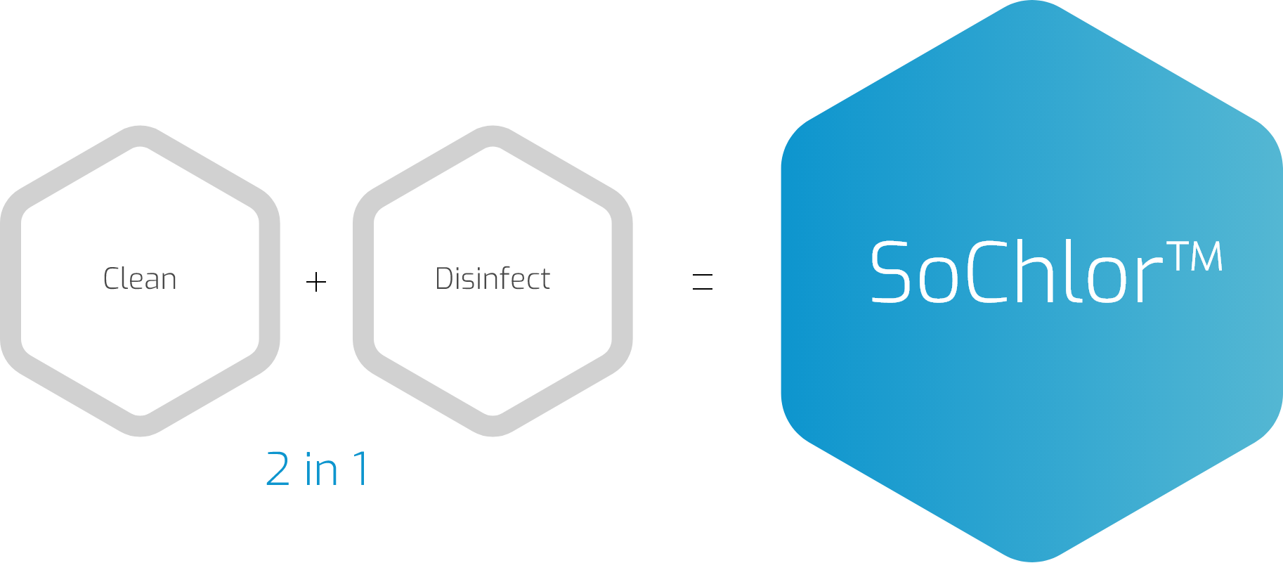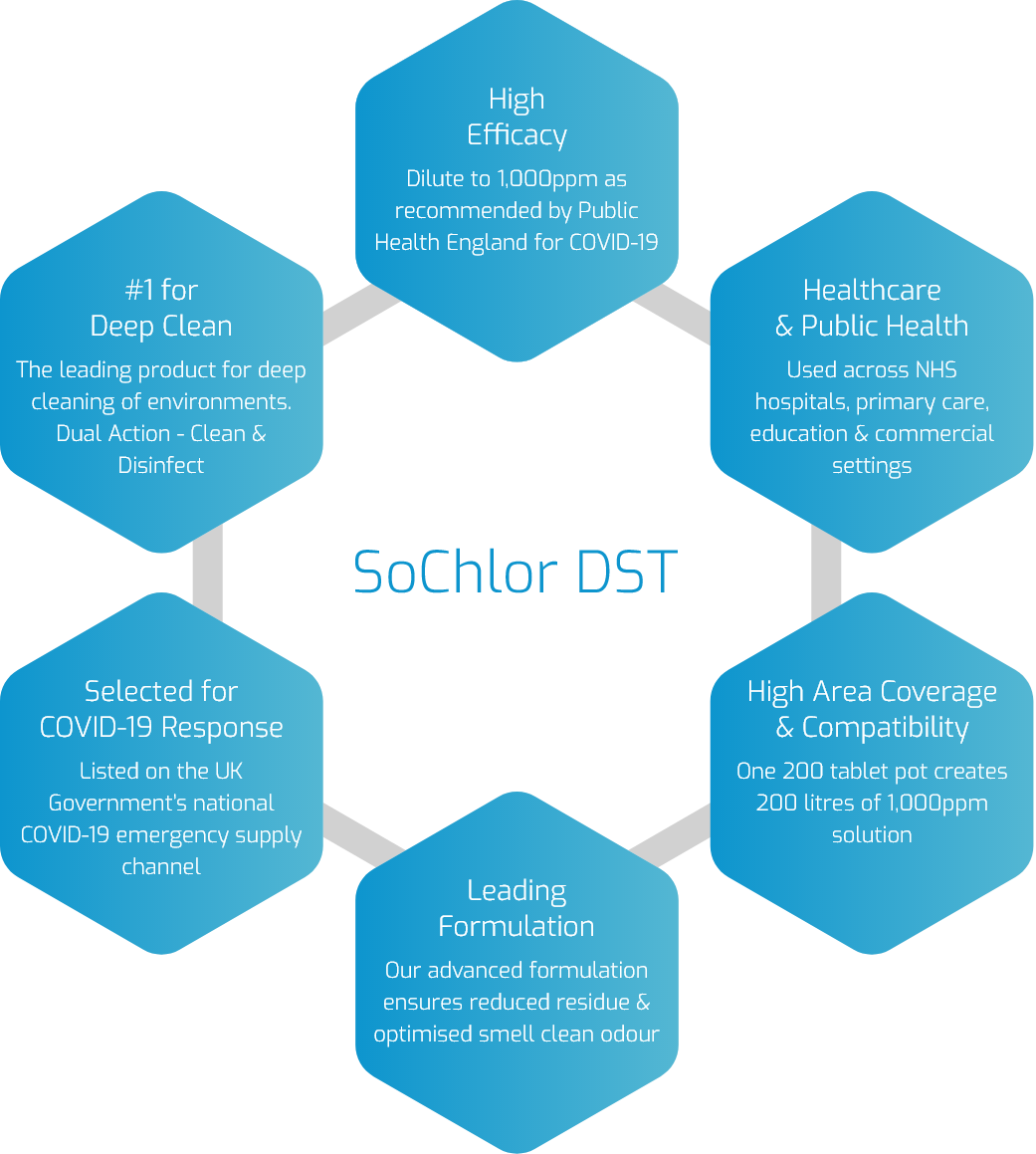 Combining Sodium Dichloroisocyanurate / Trocloscene Sodium (NaDCC) chlorine with a compatible detergent, dual action SoChlor™ Detergent Sanitising Tablets (DST) deliver effective environmental cleaning, surface decontamination and disinfection in healthcare and public health. SoChlor™ DST reduces cleaning time and improves efficiency by combining the traditional three stage clean-rinse-disinfect routine into a single process.