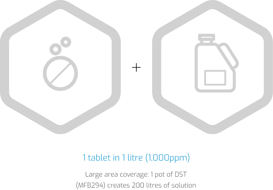 Add 1 tablet to 1 litre of water to create a 1,000ppm available chlorine dual-action solution